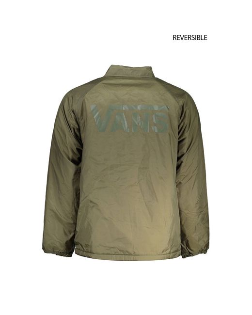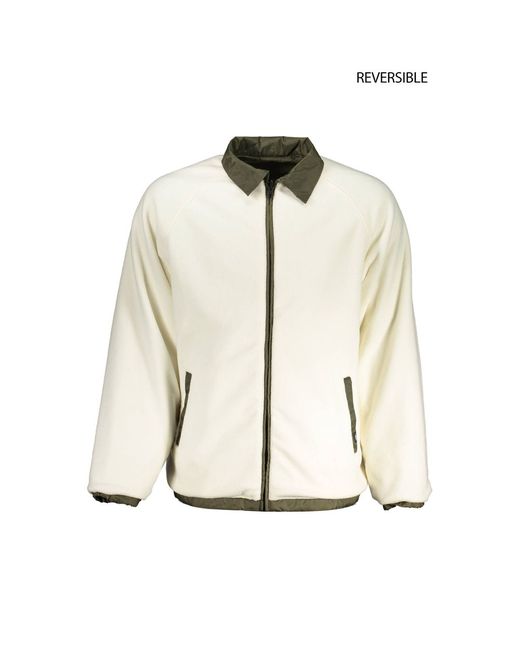 long sleeved jacket, reversible, green/white, waterproof/fleece, 2 outside pockets, 2 inside pockets, contrasting details, buttons and zip, print, logo