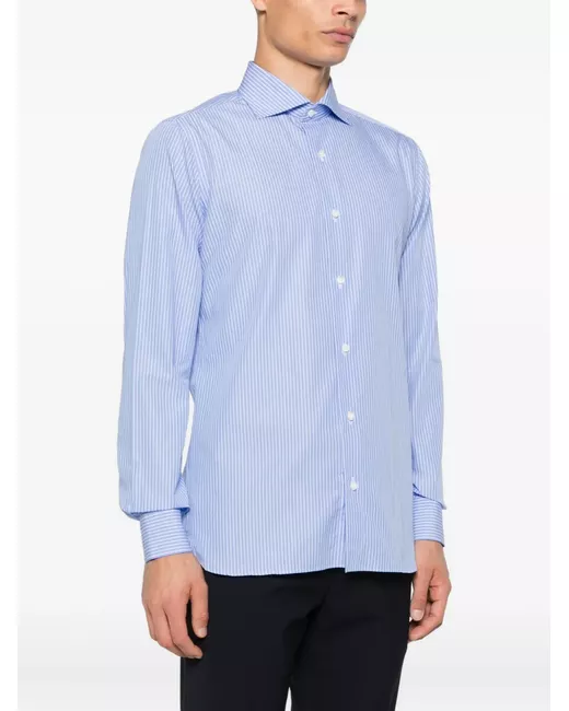 light blue vertical stripes long sleeves button fastening point collar cotton material