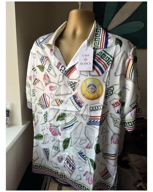 The Casablanca Le Vase Brise Shirt is a stylish and comfortable men's T-shirt made from cotton jersey fabric. It features a graphic print design with a logo accent, short sleeves. This multicoloured shirt is machine washable and has a regular fit, perfect for summer wear. Manufactured in Portugal in the current year, it is a versatile addition to any man's wardrobe, offering both quality and style for casual everyday wear.