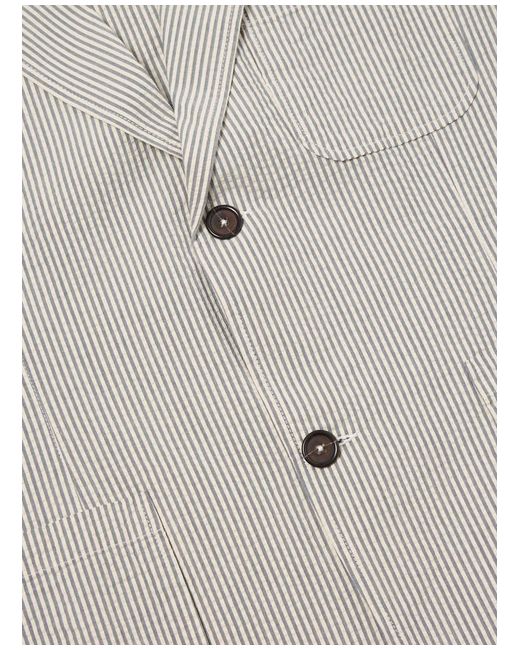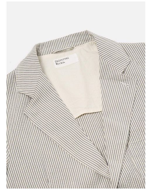 Universal Works Two Button Jacket in Grey Derby Stripe A new contemporary-looking jacket, with slight shaping, a longer, slightly wider lapel and two-button fastening. The fit is loose and unstructured, bringing a casual fit to a formal style.