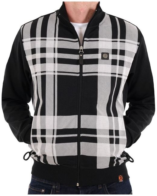 Front panel featuring raised house check oversized print. Ribbed collar, cuffs & hem. Made from 70% polyester & 30% cotton. Machine washable. Side zip pockets. Model is a 41" chest & wearing size Large.