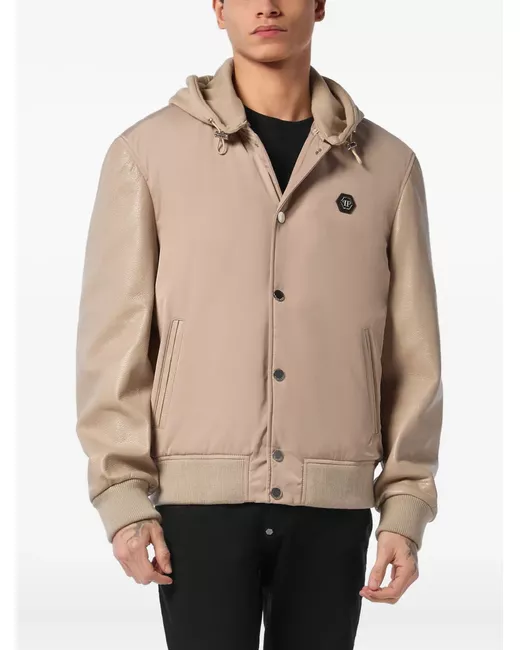 Leather sleeves hooded bomber jacket