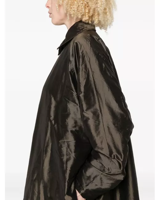 moss green silk fabric collared neckline button fastening three-quarter sleeves A-line shape
