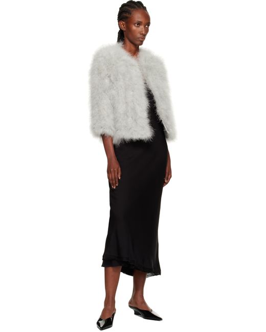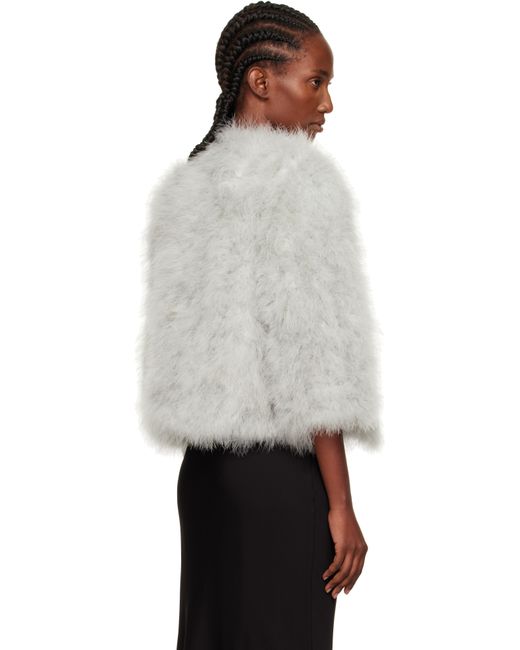 Lightweight turkey feather jacket. · Round neck · Hook-eye closure · Welt pockets · Cropped hem · Three-quarter sleeves · Full silk satin lining Supplier color: Vancouver Body: 100% turkey feather.