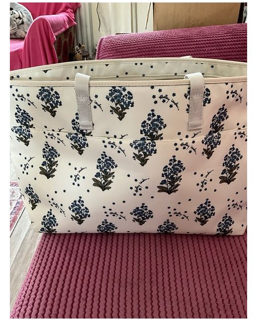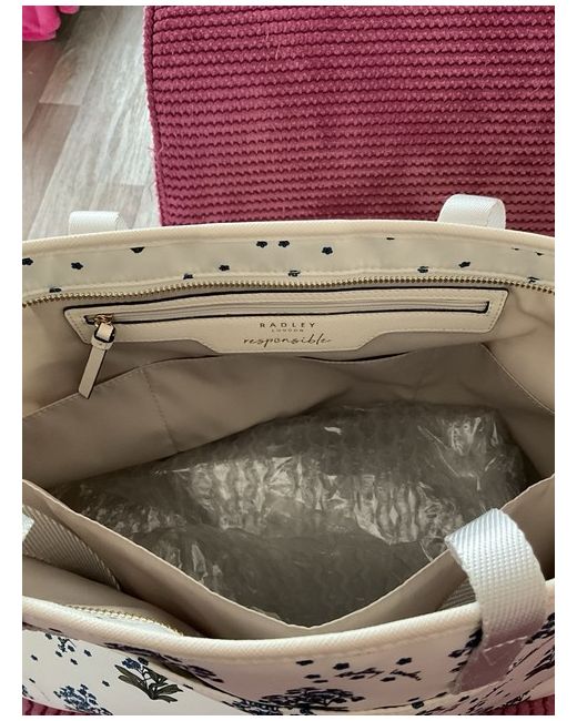 The Radley Bag is a large shoulder bag in white with blue floral pattern, featuring a zip closure and crafted from recycled exterior material. It is designed for casual occasions, with inner pockets for organization and a leather handle/strap for comfort and durability. This stylish bag from the Radley brand includes a charming accessory, perfect for women looking for a versatile and on-trend accessory for everyday use. The Maple Cross / Forget Me Not model exudes a timeless elegance with a touch of floral embellishments. Have cross body bag to match £100 for both. 50cms X 30 cms