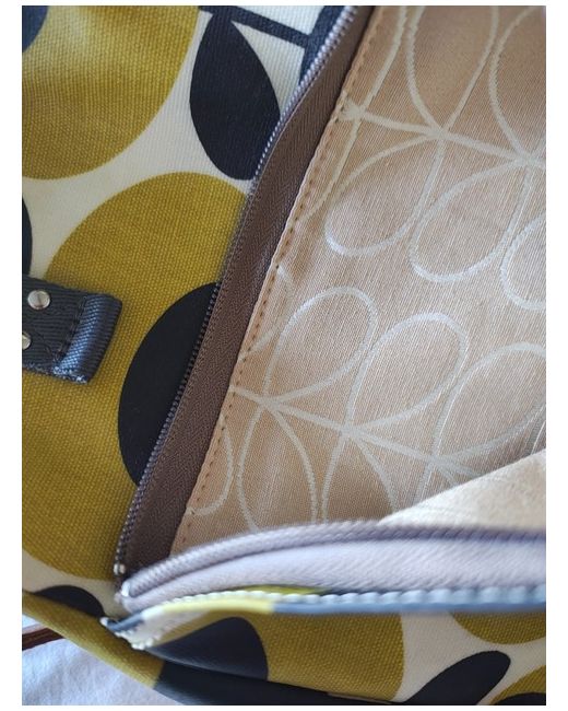 100 percent coated cotton canvas/PVC. Mustard and black and white stem design. Can be wiped clean with a cloth. Rubberised feet at base. Fully lined interior with beige stem design fabric. Features: Outside, zipped front panel with leather pull.