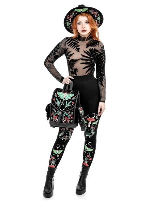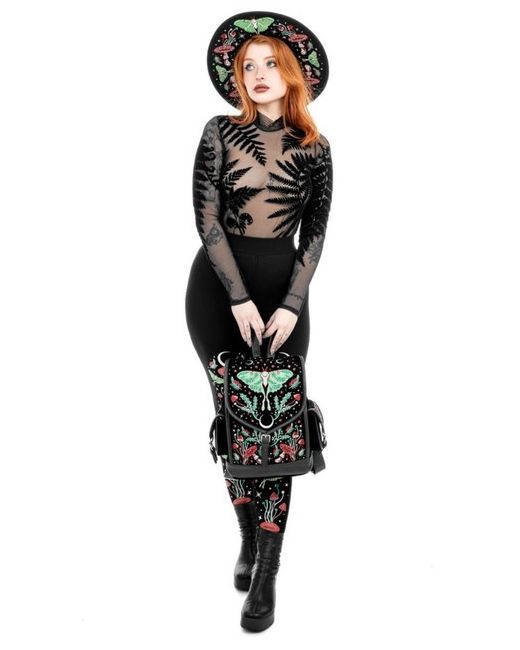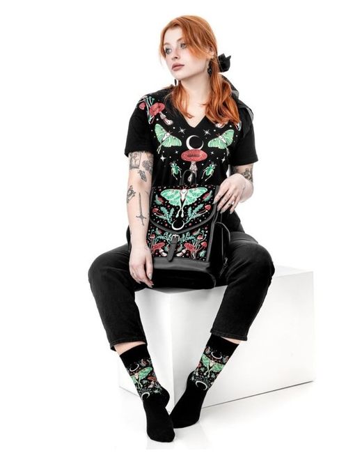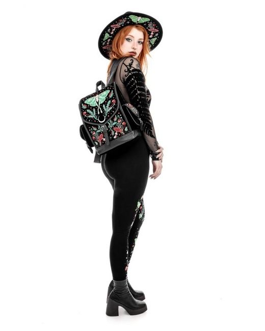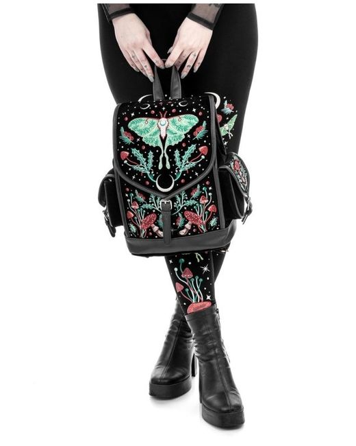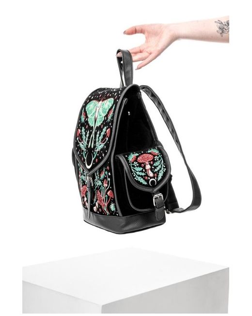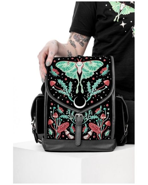 Intricate Luna Moth, fungi, and celestial embroidery. Made from luxurious black velvet and vegan leather, it combines deep, retro colors with practical features. Back zip pocket and interior pockets for extra storage.
