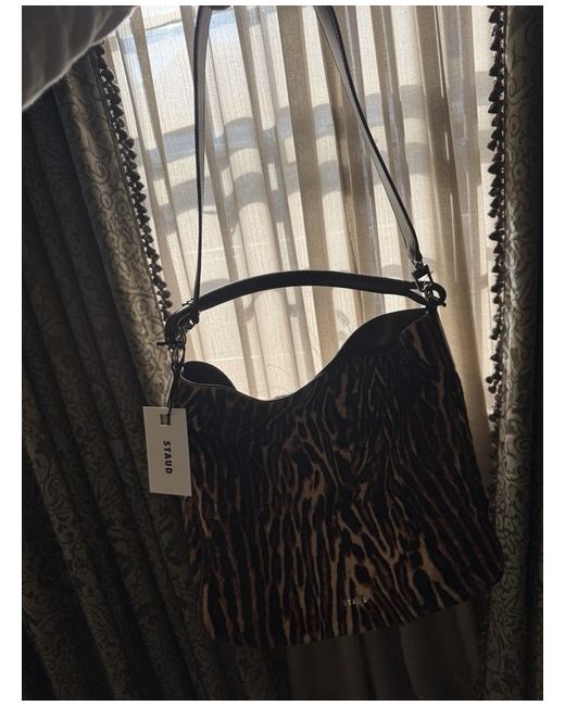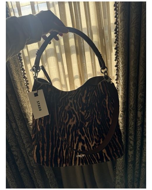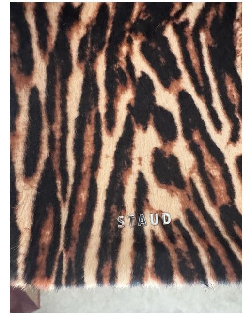The brown exterior adds a touch of sophistication to the overall look, making it a versatile accessory for any outfit. This handbag from STAUD is a trendy choice for those looking to add a touch of wildlife-inspired flair to their wardrobe.