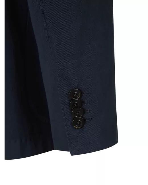 dark blue button fastening patch pockets notched lapel long sleeves buttoned cuffs