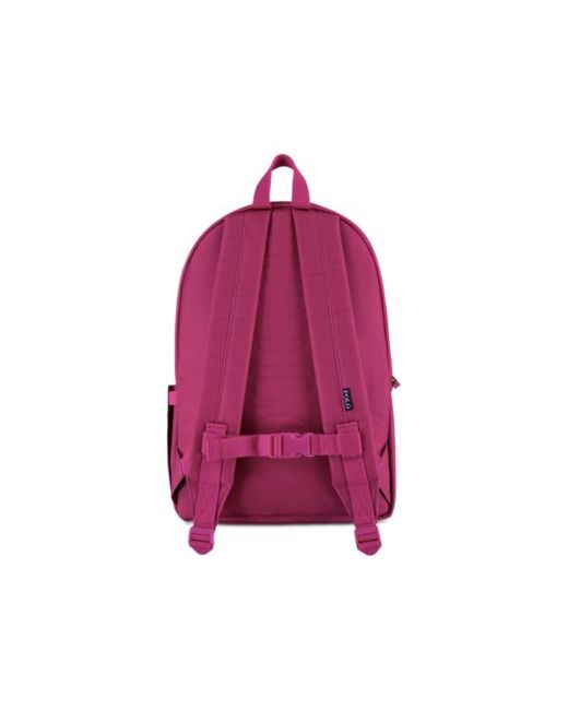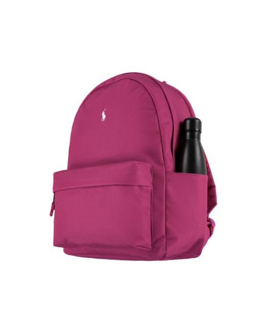 Durable poly oxford fabric. Small embroidered Polo Pony on front. Zippered main compartment. Inner zippered mesh organizer pocket. Zippered padded laptop compartment on back. Front zip pocket. Bottle pocket on right side. Adjustable shoulder/chest straps. Grab handle on top.