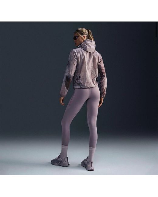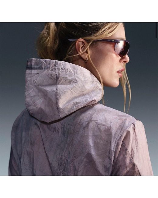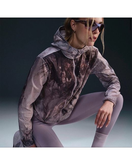 The Nike Trail Repel Running Jacket in Light Violet is a stylish and functional activewear piece designed for women. Made from lightweight, water-repellant nylon with a softshell fabric technology, it features a full zip closure, zipped pockets, and a hood for added protection. The mid-length windbreaker jacket is perfect for all seasons, including running and cross-training activities. Its multicoloured design with a tie-dye pattern adds a fun and vibrant touch, while the reflective fabric technology ensures visibility during low-light conditions. Easy to care for with machine washable properties, this Nike Repel jacket is a must-have for your fitness wardrobe.