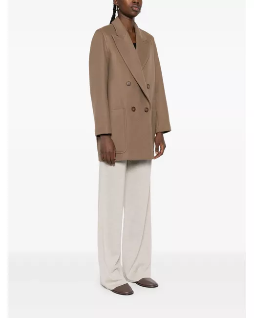 brown double-breasted fastening patch pockets peak lapels long sleeves straight hem