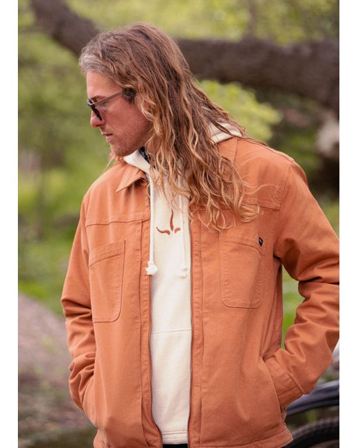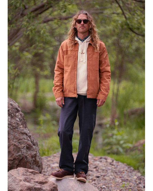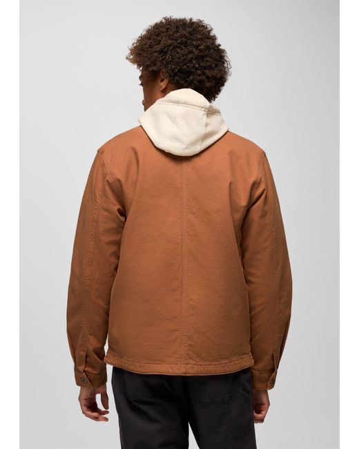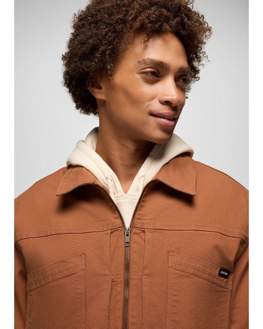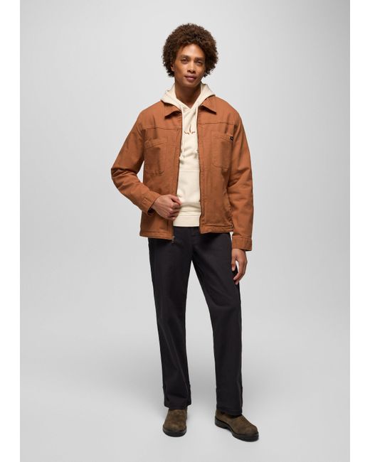 Workwear-inspired style in a standard-fit canvas jacket with a soft flannel lining and washed down effect. Embrace cool-weather walks and daily commutes with the Rock Ridge Jacket. Inspired by traditional workwear, this standard-fit zip-up jacket has a washed dpwn effect and is made with a stretch canvas from organic and recycled cotton. It features two chest pockets, two hand pockets, a flannel-lined body, and taffeta-lined sleeves for elevated comfort. | Mens prAna Rock Ridge Jacket in Orange, Size Small