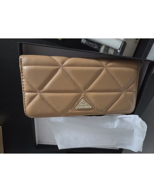This PRADA Women's Leather Purse in beige features a zip-around style with credit card slots, perfect for keeping your essentials organized. Made in Italy from high-quality leather, this wallet exudes luxury and sophistication. With a classic pattern and sleek design, it is a versatile accessory that can elevate any outfit. The purse measures 9 inches in length and 4 inches in depth, making it the ideal size for on-the-go use. This stylish and practical item is a must-have for any fashion-forward woman.