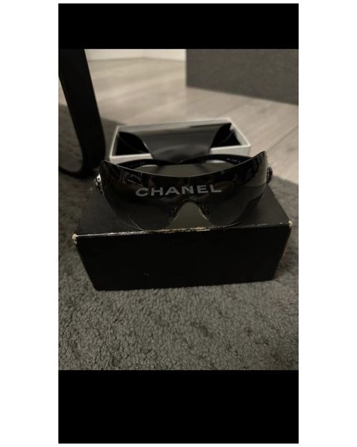 These Vintage Chanel Sunglasses are a stylish and classic accessory for women. Made in Italy, they feature a wrap style design with tinted plastic lenses in a sleek black frame. Please check all photos for marks on the sides