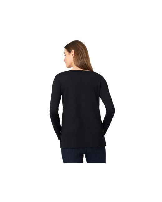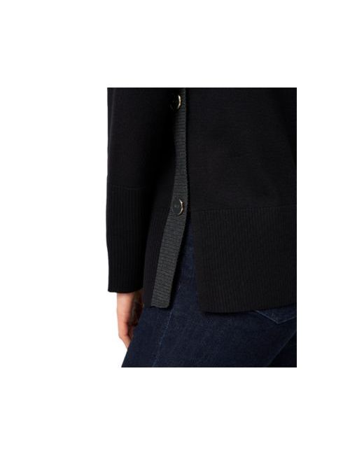 Contrasting trim decorated with buttons down the sides adds a fresh touch to this classic crewneck tunic sweater from Melissa Paige.
