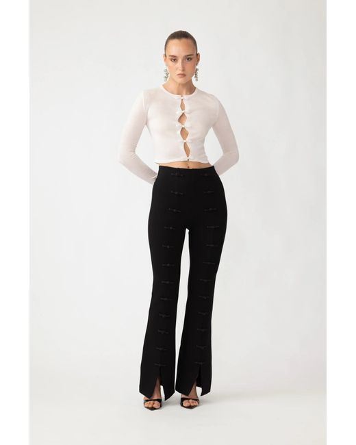 The Drew Pant is a mid-rise, flared-leg pant featuring signature hand-tied pipa knots that trace the front seam of each leg and lead to a bottom open slit. A modern twist on a vintage silhouette, perfect for styling into a versatile everyday look or casual occasion.