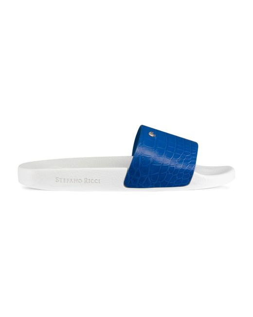 Offering the ubiquitous Stefano Ricci take on casual classics with a twist of elegance, these matted crocodile leather slides ensure that even the most casual of footwear choices are infused with luxury. Boasting the iconic eagle head in precious metal decorative hardware and embossed brand logo details, this pair will demand admiration. Matted crocodile leather Slip-on style Eagle head motif Entwined Stefano Ricci logo on sole Embossed brand logo Made in Italy. Lsd Mens - Mens Rtw Lsd Mp > Stefano Ricci > Saks Fifth Avenue. Stefano Ricci. Color: Poseidon Blue. Size: 6.