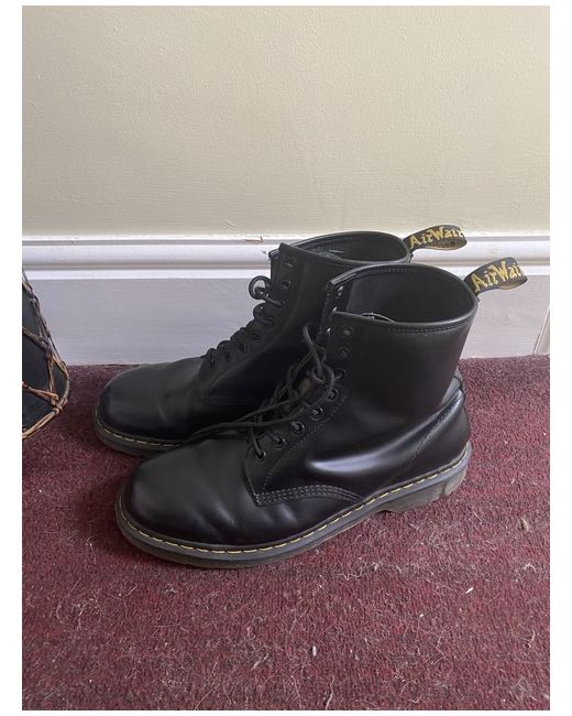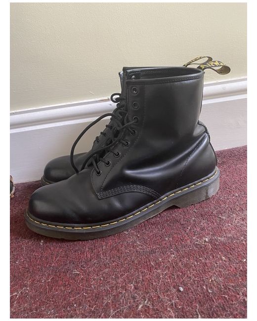 The product is a pair of Dr. Martens boots in black leather, featuring a platform style with a low heel height. These mid-calf boots have a round toe shape and standard shoe width, making them suitable for casual occasions during the winter season. The unisex boots are part of the Dr. Martens 1460 product line and are made with high-quality leather, ensuring durability and style for the wearer. Perfect for someone looking for a classic and versatile addition to their footwear collection.