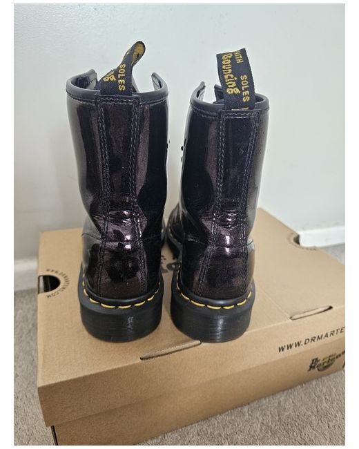 The Dr. Martens 1460 Women's Purple Sparkle Size 3 is a stylish ankle boot with a round toe and lace-up closure. Made with leather lining and upper material, this combat-style boot is perfect for casual occasions. The patent leather outsole adds a touch of festival or metal theme to your outfit, making it a versatile choice for all seasons. With its standard shoe width and calf width, this boot combines comfort with a trendy design from the iconic Dr. Martens brand. worn twice around the house, received as a gift but sadly they are a size small. Picture shows crease at ankle when they've been tried on.