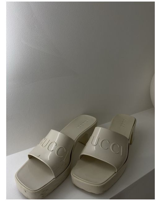 Have a few marks, nothing a little polish can’t remove - otherwise, good condition. Retail price: £430 The Gucci Cream Rubber Platform Slide Sandals are a stylish and comfortable option for women. Featuring a block heel and low heel height, these sandals are perfect for everyday wear. Made from high-quality rubber, both the upper and outsole materials provide durability and support. The clean white colour adds a touch of sophistication to any outfit, making them a versatile choice for summer. With the renowned Gucci brand, these sandals are sure to make a statement.