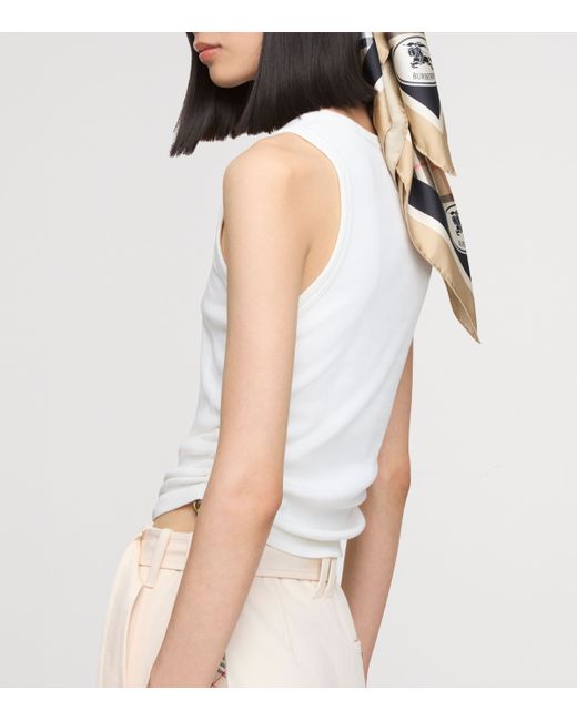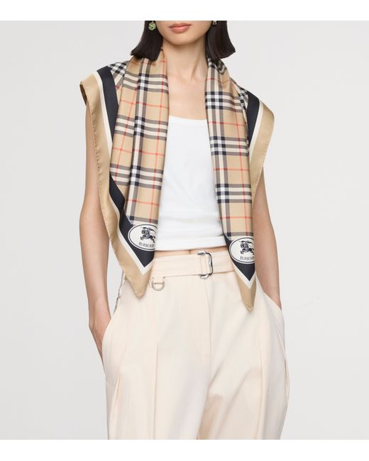 Crafted in Italy from fluid silk twill, this scarf is printed with the iconic Burberry Check, framed by bold contrast stripes for graphic impact. The archival Knight stamp and corner lettering lend a distinct heritage signature, while hand-rolled edges underscore the artisanal finish of this refined, square-cut accessory.