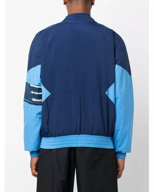 patchwork zipped jacket from United Rivers featuring blue, patchwork design, colour-block panelled design, bleached effect, funnel neck, front zip fastening, silver-tone hardware, long sleeves, elasticated cuffs, two zip-fastening chest pockets and elasticated hem.