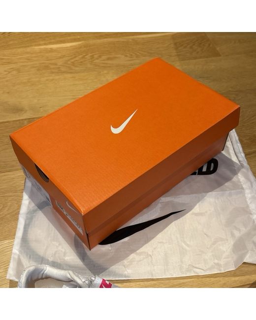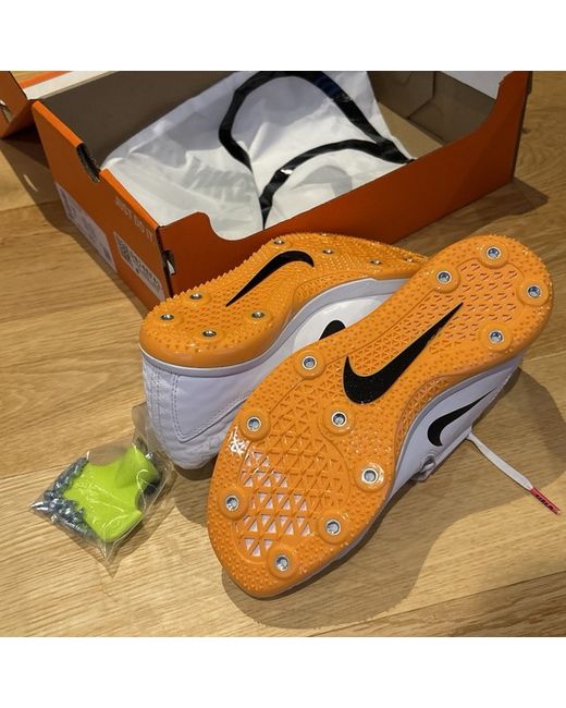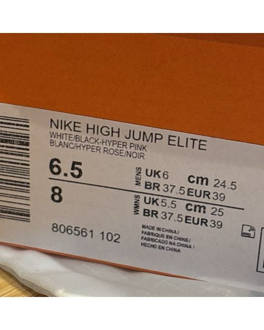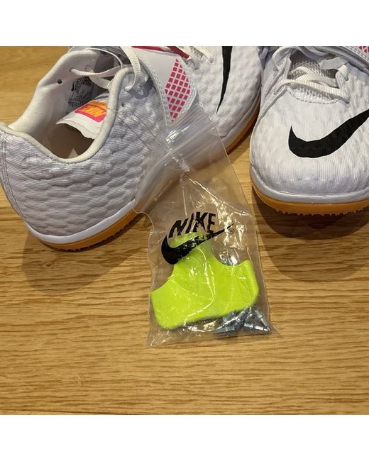 This is a new pair of Nike High Jump Elite trainers in white and pink. The trainers are designed for track and field athletes, particularly high jumpers. They are a UK size 6, US size 6.5, and EU size 39. The model features spikes and a sporty sneaker style, perfect for those involved in athletics.