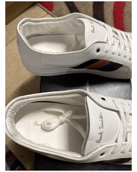 The Men's Paul Smith Trainers in UK size 11 are a stylish and comfortable choice for casual occasions during the summer season. These lace-up trainers feature a white colour with a leather lining and rubber outsole, providing durability and support for everyday wear. The Paul Smith brand adds a touch of luxury to these sneakers, making them a fashionable choice for men looking to elevate their footwear collection. The classic design and high-quality materials make these trainers a versatile addition to any wardrobe.