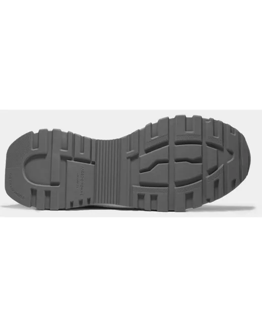 Dark grey tread. Grey suede. Unit 75-76 First Floor. Blue ballistic nylon inner panels. Thin blue printed line detail. Blue leather tongue tab. Blue gloss heel clip. White leather accents.