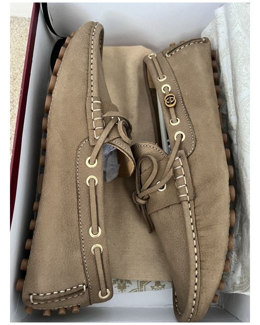 Gucci Mens tan leather moccasins front leather lace with logo sole brand new in box. Great look for the summer, slightly too small hence selling. Size 41 UK 7