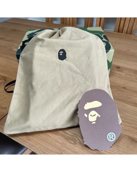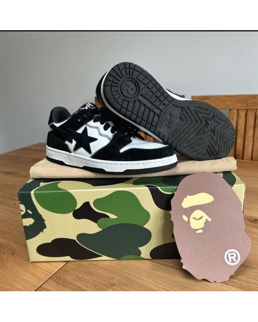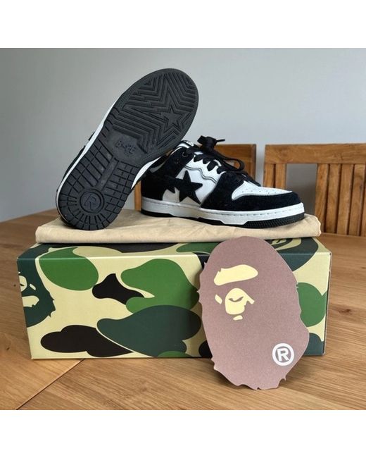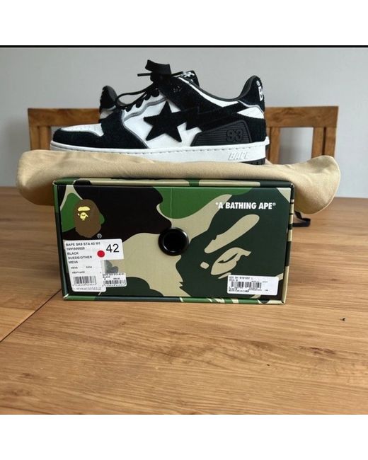 The A Bathing Ape SK8 STA #3 sneaker is a stylish and casual trainer designed for men, featuring a low top shaft style with a lace-up closure. Made with swede upper material and manufactured in Japan, this black sneaker is part of the A Bathing Ape Bapesta product line. With a UK shoe size of 7 and US size of 8, this sneaker is not signed or customised, making it a versatile choice for everyday wear.