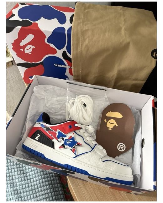 This was never worn before and is limited edition Retail price is 259 as shown in the picture It comes with everything shown including the dust bag and extra laces aswell as the box Throw me reasonable offers and they will be accepted Ask me questions and they will be answered Ask me for more pics they will be given Same day shipping Size is 10 but fits a bit smaller in my opinion The A Bathing Ape Bapesta Men's Size 10 UK trainers are a stylish and casual choice for the summer season. With a classic lace-up closure and white colourway, these sneakers showcase the iconic A Bathing Ape branding. Made from leather material, they are durable and comfortable for everyday wear. Perfect for men looking for a versatile and trendy footwear option.