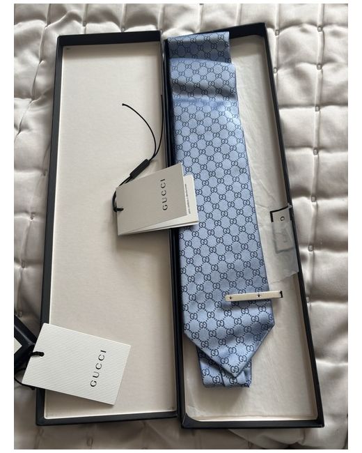 This tie is stated in a Double G silk jacquard and reveals a Gucci bee label on the back. 100% AUTHENTIC!!! Product Details Light blue Double G silk jacquard Gucci bee label on the back W7cm x L146 cm Made in Italy