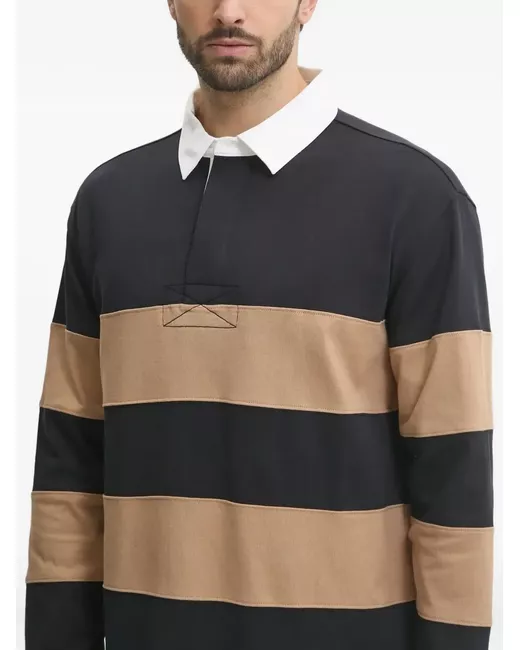black beige stripes long sleeves button placket polo collar contrast white collar