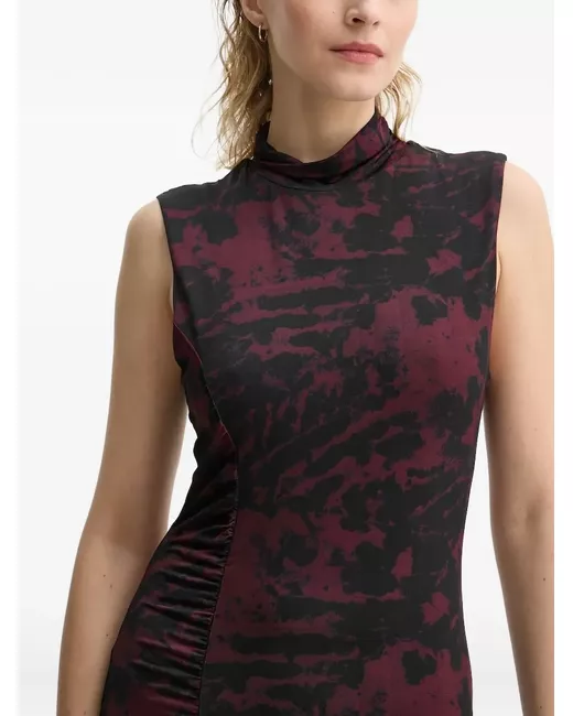 burgundy abstract print sleeveless high neck fitted bodice side ruching