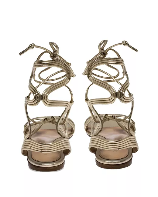 gold-tone leather metallic tie-fastening ankle strap open toe flat leather sole Condition: GOOD. This previously owned and used item is in good condition with minimal signs of use. This may include fading of material or plating and scratches.