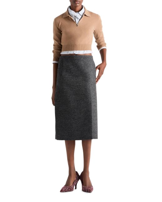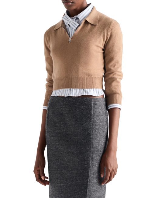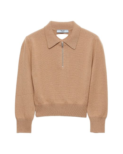 Three-quarter sleeve Plain knit Slim-fit silhouette Ribbed knit collar Semi-raglan shoulder Ribbed knit cuffs and hem Knit triangle logo Half-zipper closure on the front Imported 100% Cashmere. Lsd Rtw - Prada Rtw > Prada > Saks Fifth Avenue. Prada. Color: Brown. Size: 2.