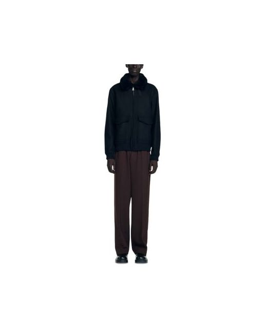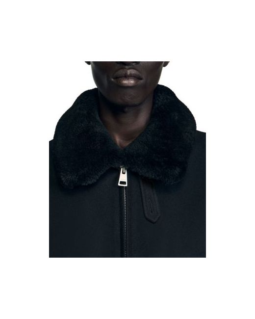 Sandro Aviator Jacket.Color:Black.Size:L.Material:70% wool/20% polyamide/10% cashmere; removable collar: 100% sheep shearling, origin: Turkey, dyed; body lining: 100% viscose; pocket lining: 100% cotton; padding: 100% polyester; rib: 49% acrylic/45% wool/5% polyamide/1% elastane.Jackets.