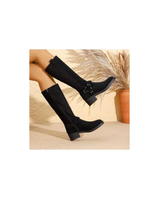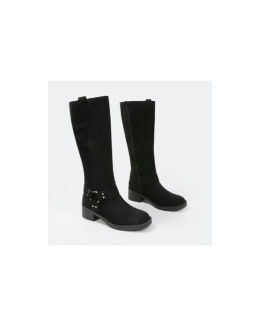 Rugged yet refined, Spencer05 faux suede knee-high boots feature a classic moto harness with metallic ring and accents for an added edge.