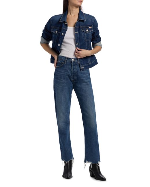 Mother's The Bruiser denim jacket, crafted of stretch cotton, is designed with a spread collar, chest flap pockets, and a button-front closure. Spread collar Long sleeves, button cuffs Chest button-through flap pockets Button-front closure 98% cotton/2% elastane Machine wash Imported SIZE & FIT About 21.5" from shoulder to hem Model measurements: 5'10" tall Model is wearing US size Small ABOUT THE BRAND An ode to growing up in California in the '70s, Mother focuses on vintage-inspired garments with a modern touch. When Lela Becker and Tim Kaeding launched their denim brand in 2010, they fully embraced the irreverent West-Coast attitude. From its cult-status jeans in a range of fits and washes to outerwear and T-shirts touting clever phrases, the label sets itself apart from the denim status quo. Contemporary Sportswear - Denim And Bottoms > Mother > Saks Fifth Avenue. Mother. Color: Perfectly Imperfect. Size: XS.