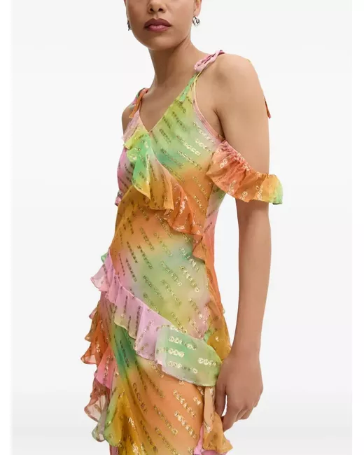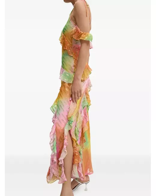 yellow/pink/orange gradient effect layered ruffles V-neckline tied spaghetti straps sequin embellishment