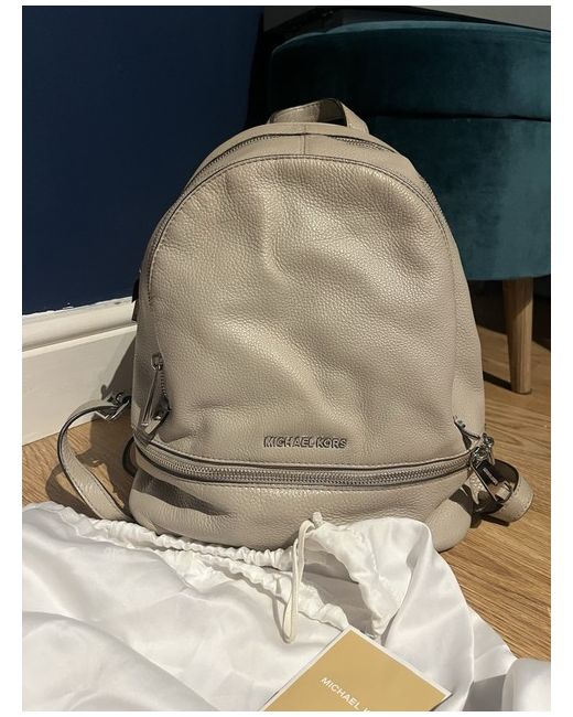The Michael Kors Rhea Women's Leather Medium Backpack in Light Pink is a stylish and versatile accessory perfect for travel, parties, or casual outings. Made from luxurious leather with a pebbled finish, this backpack features silver hardware accents and a zip closure. The interior is lined with beige canvas and includes inner and outer pockets for added functionality. The designer logo adds a touch of elegance, making this backpack a classic and chic addition to any wardrobe.