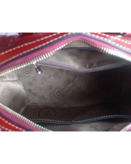 This beautiful Aphison women's embossed leather handbag features a rose pattern on its dark red exterior. The bag is medium in size and has a zip closure, with a fabric lining in gold. The dark red leather handles adds a touch of sophistication, while the gold hardware complements the overall design. This top handle bag is a stylish accessory for women, perfect for adding a touch of elegance to any outfit. The detachable strap offers versatility in how the bag can be carried. New and unused with dustbag. Length 28cm. Width 17cm. Height 18cm