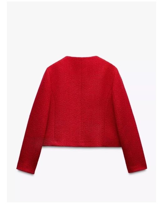 The Zara Textured Blazer with Golden Button Detail is a stylish and classic military jacket perfect for a business occasion. Made from polyester, this red blazer features a button closure and is in size XS. The Zara brand ensures quality and a timeless design that will elevate any outfit. Perfect for the spring season, this blazer is a versatile piece that can be dressed up or down for any occasion.