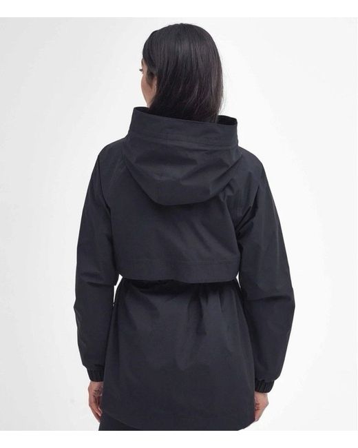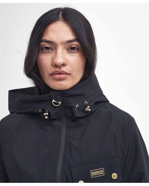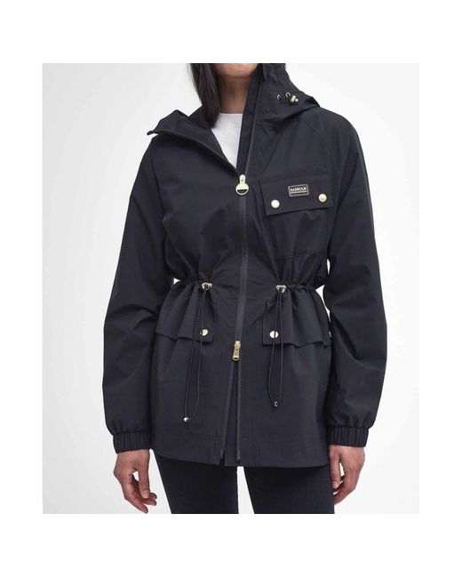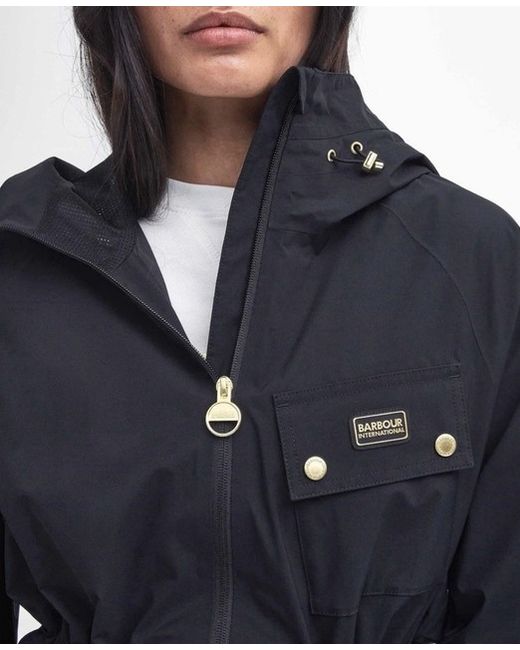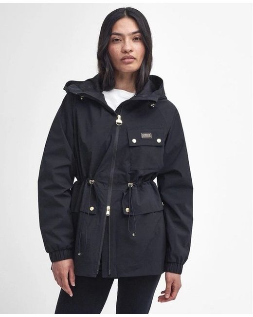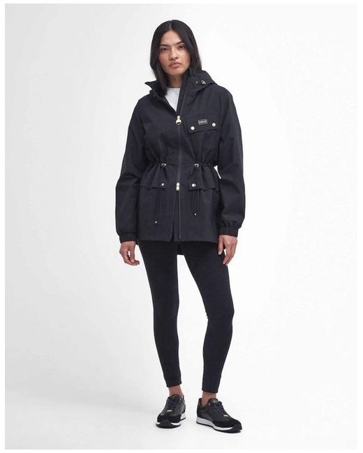 The Barbour International Alicia Waterproof Jacket combines style and function in a sleek short silhouette. Crafted from lightweight fabric, it’s perfect for layering, while an adjustable drawcord waist offers a flattering fit. Finished with a snorkel hood for added rain protection, this jacket is a must-have for unpredictable weather—ideal for commuting, countryside walks, or weekend errands. Product Highlights: - Branding on the chest gives this piece a signature look. - Multiple pockets for added utility. - Composition: Refer to the care label for further information.