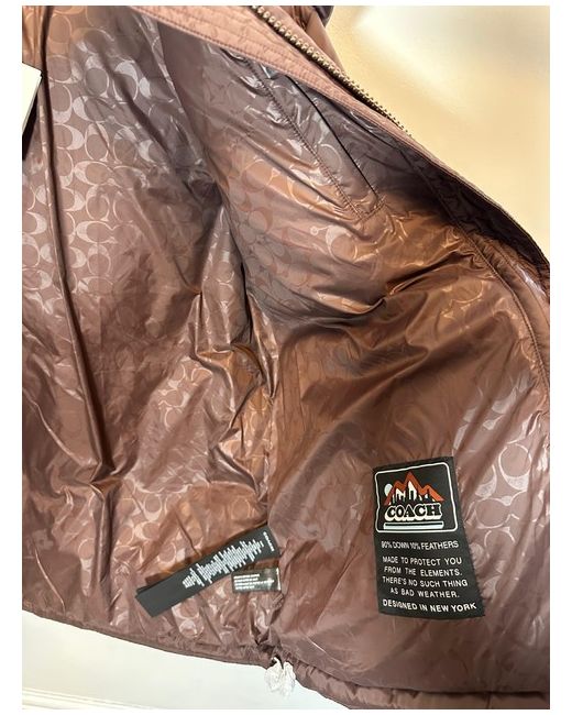 This Coach puffer jacket combines comfort, warmth, and style. The fit is slightly cropped and insulated for cold weather, with secure snap-button pockets and elasticated cuffs. Features: Monogram panel, detachable hood, zip closure, insulated.