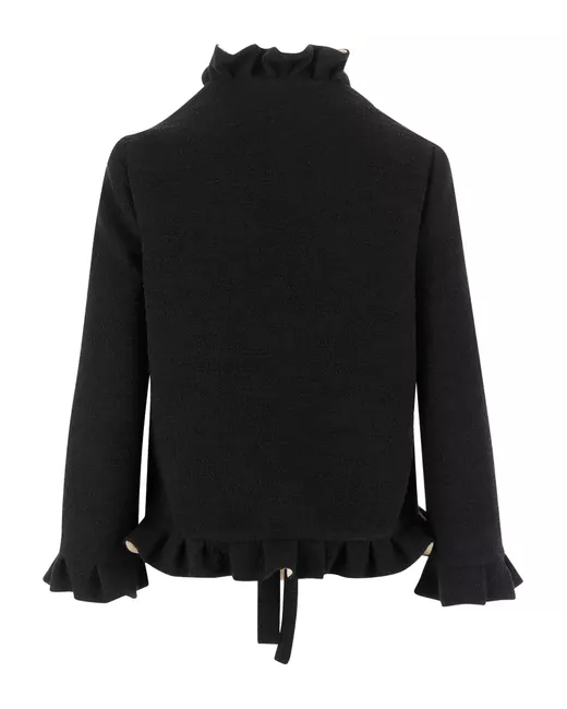 black wool-blend ruffle details front closure long sleeves patch pockets