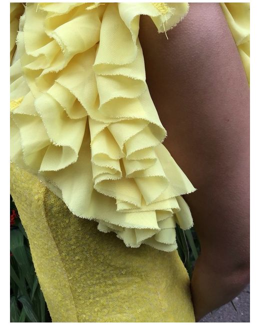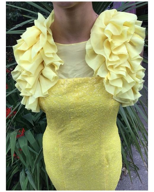 Striking canary yellow long glamorous unusual dress with a rear trail . Long sparkling sequinned bodice culminating in a lower floaty skirt section which trails to the rear Frilly big layered puffy short sleeves Zip to rear with yellow transparent décolletage Size 8 Length with trail 64 inches Gorgeous scrumptious swishy dress Bought in sale but not worn Film star