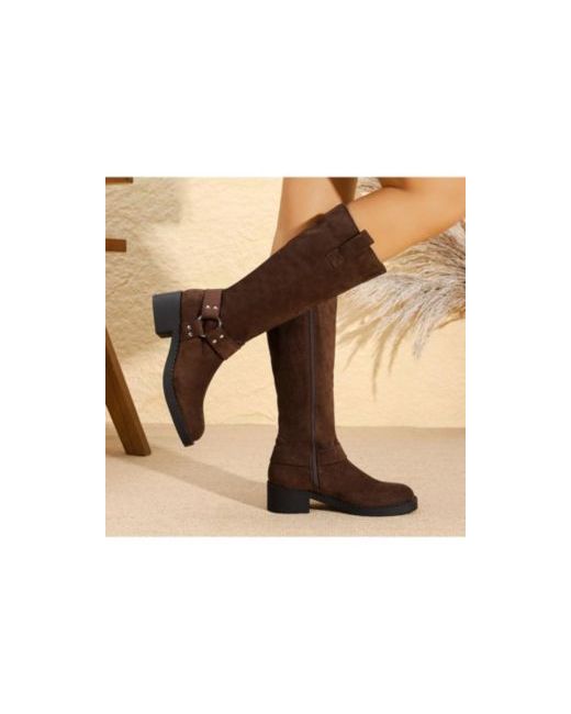 Rugged yet refined, Spencer05 faux suede knee-high boots feature a classic moto harness with metallic ring and accents for an added edge.